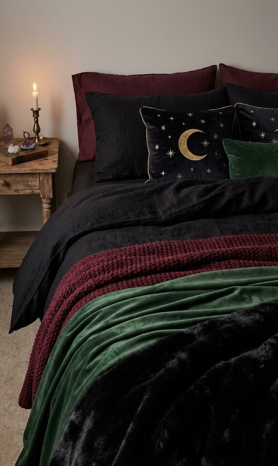 The witchy dark aesthetic is one of the fastest-growing interior design trends — rich textures, mystical symbols, deep shadows, crystals, velvet, and moody lighting. But here’s the good news: you don’t need a huge budget to create a stunning witchy bedroom that feels luxurious, intentional, and full of magic.
